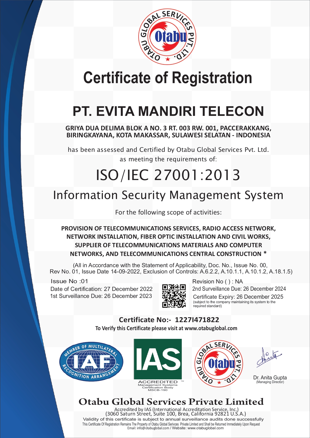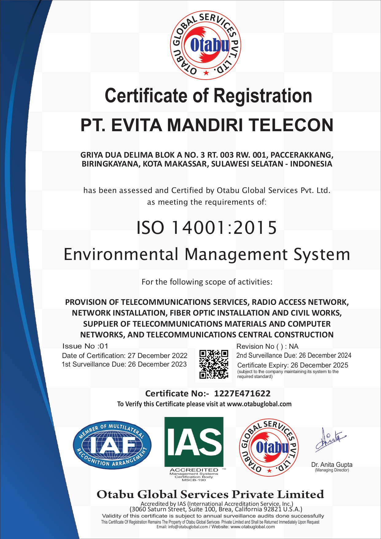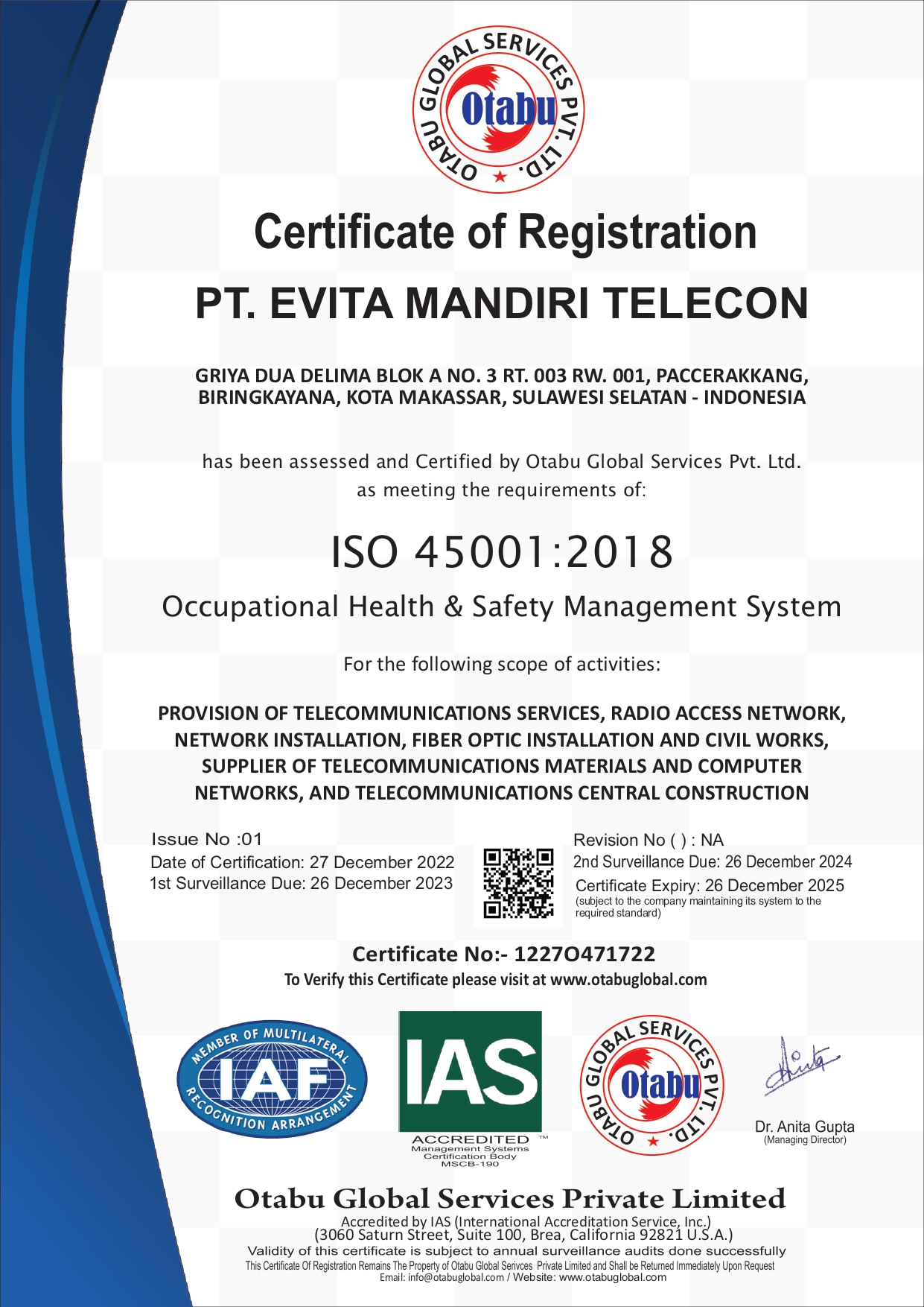 Kami adalah Kontraktor Telekomunikasi terkemuka di wilayah Indonesia Timur. Kami bekerja pada tahun 2013 sebagai CV. Evita Mandiri, selama tahun 2019 telah berubah menjadi PT. Evita Mandiri Telecon dan mengembangkan pengetahuan dan pengalaman yang luas di berbagai bidang. Tidak peduli mengapa Anda memperkerjakan kami, Kami berkomitmen untuk memastikan untuk memberikan kepuasan 100 persen untuk setiap pekerjaan yang kami ambil. Hubungi kami untuk mengatur Konsultasi tanpa kewajiaban hari ini